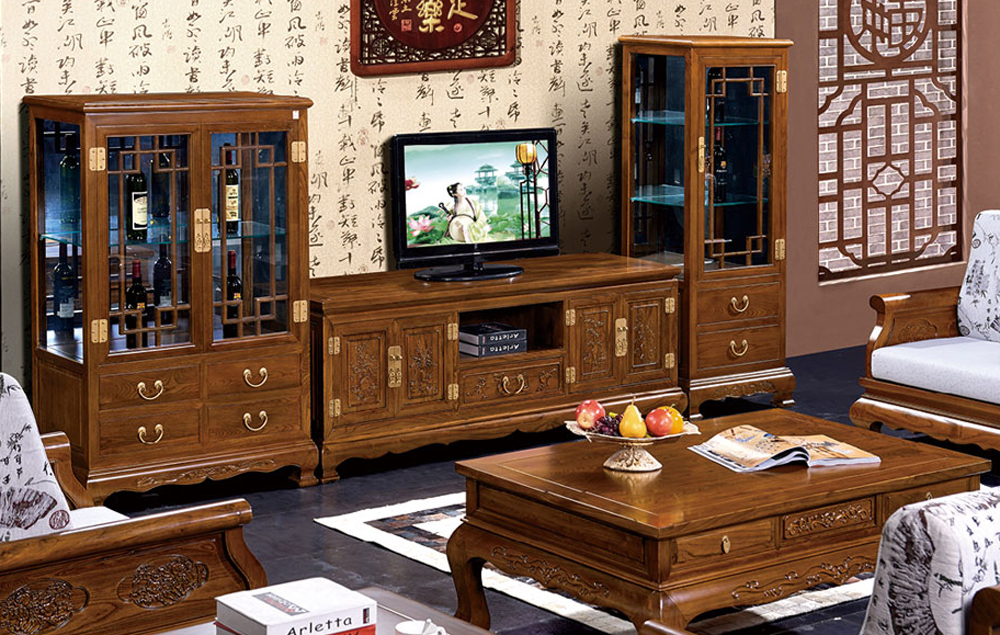 榆木雕花茶几电视柜配套家具效果图 泷泰中式仿古家具供应商